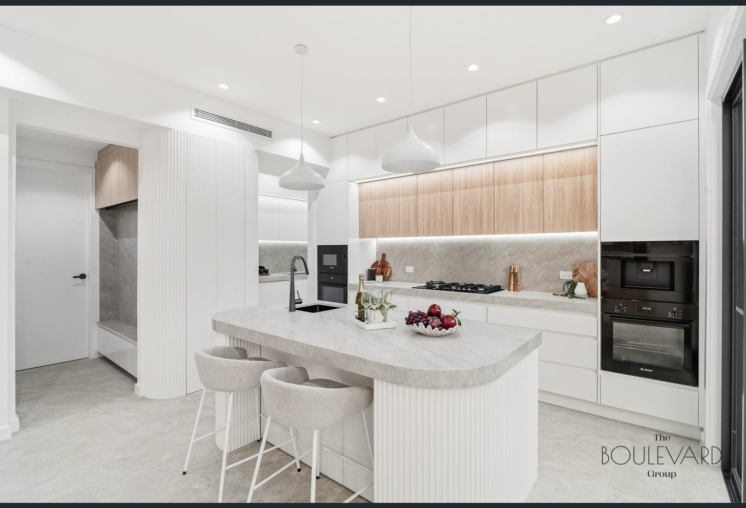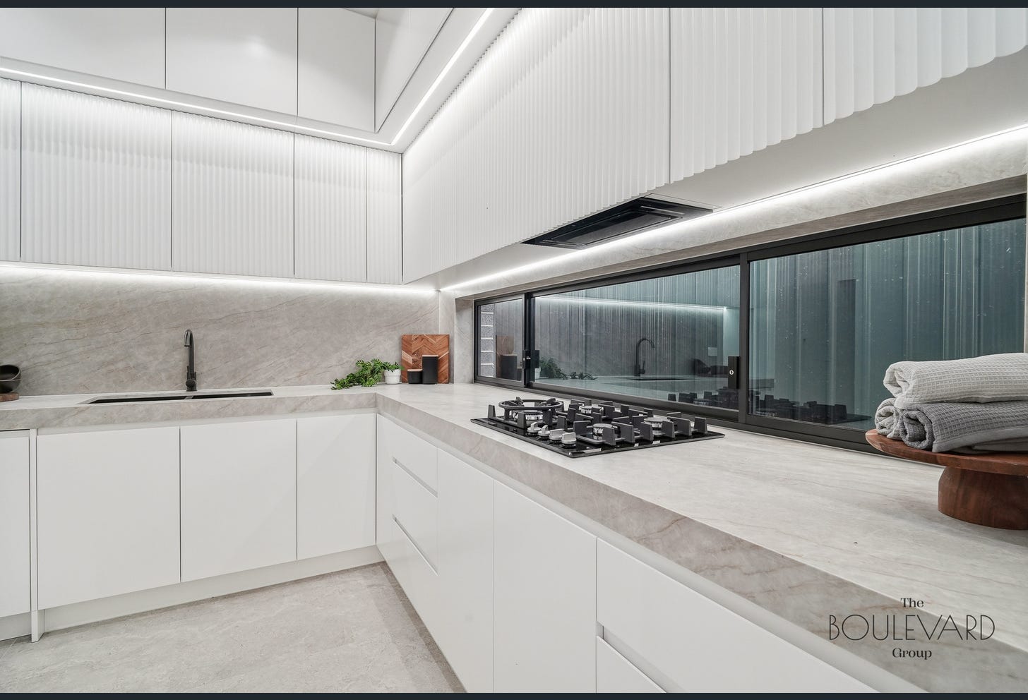 Then colour. The ground floor staging held a tight cream-stone-white palette with gold hardware accents — the brass floor lamp beside the fireplace, the gold-frame glass coffee table, a crystal ring chandelier that caught the light from the clerestory windows. Nothing competed with the marble. Nothing introduced warmth that the stone did not already suggest. The kitchen island — fluted, rounded, topped with that eighty-millimetre marble slab — was styled with champagne, grapes, and copper canisters. Not decorative. Aspirational. A buyer looking at that photo sees dinner parties, not a bench.