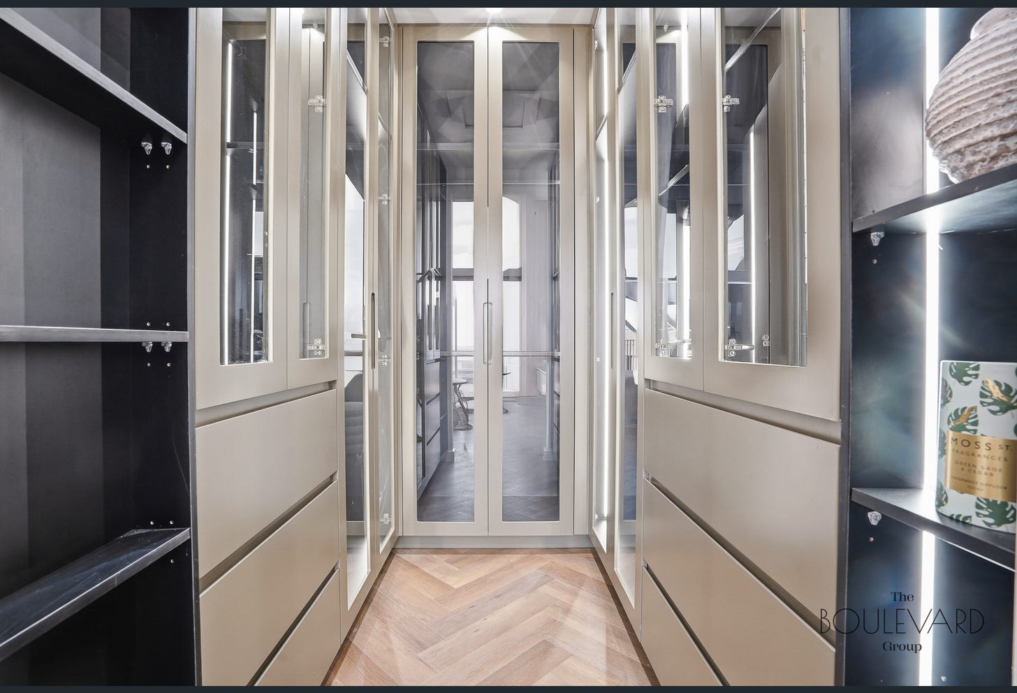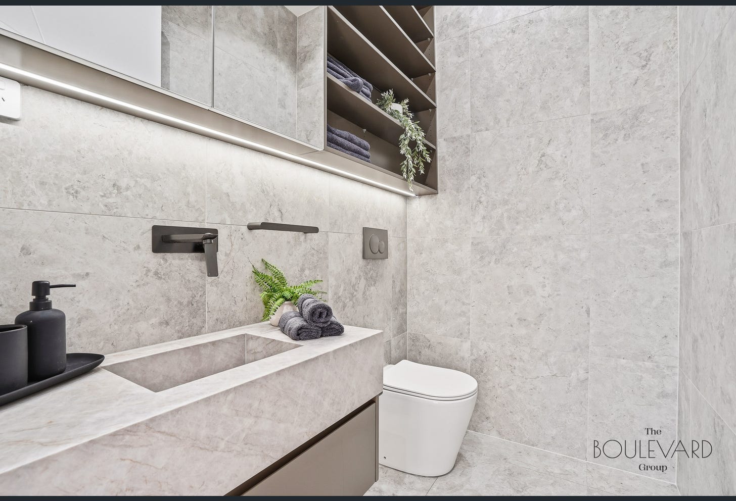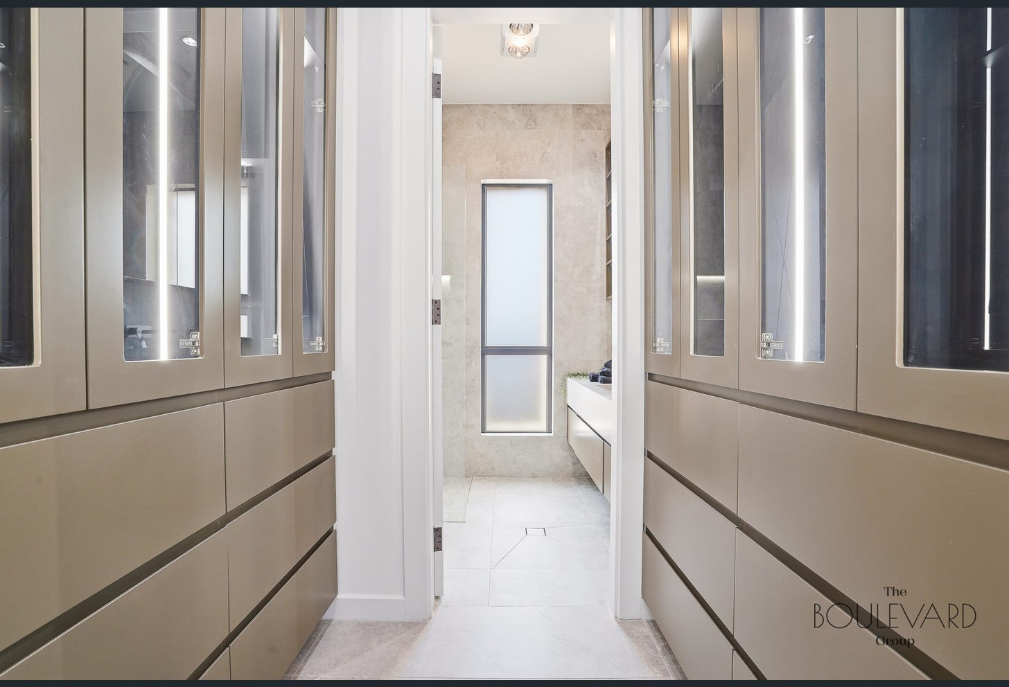 Three buyers asked the agent at the first inspection whether the onyx wall was real stone or a printed panel. It is real. But the fact that the staging beside it — the amber-toned ceramics, the woven vase, the sculptural objects placed at three heights on the floating shelves — made them look twice tells you exactly how well the styling served the architecture.