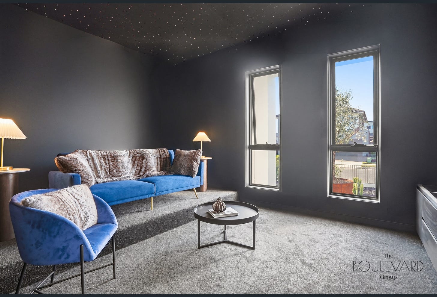The brief was one of the largest Goldpac has staged in Sydney's north-west — six bedrooms, three separate living zones, a dining room, a study, an alfresco, a cinema room, and an entry foyer with a double-height void. Every space had a different architectural personality. The ground floor was stone and marble — cool, polished, Mediterranean. The upper level switched to warm herringbone timber and gold-toned accents. The cinema room was its own world entirely — dark walls, dark carpet, a star ceiling. The onyx wall sat between the two, glowing like a lit fireplace. The staging had to honour each of those moods without turning the house into a showroom of disconnected rooms.