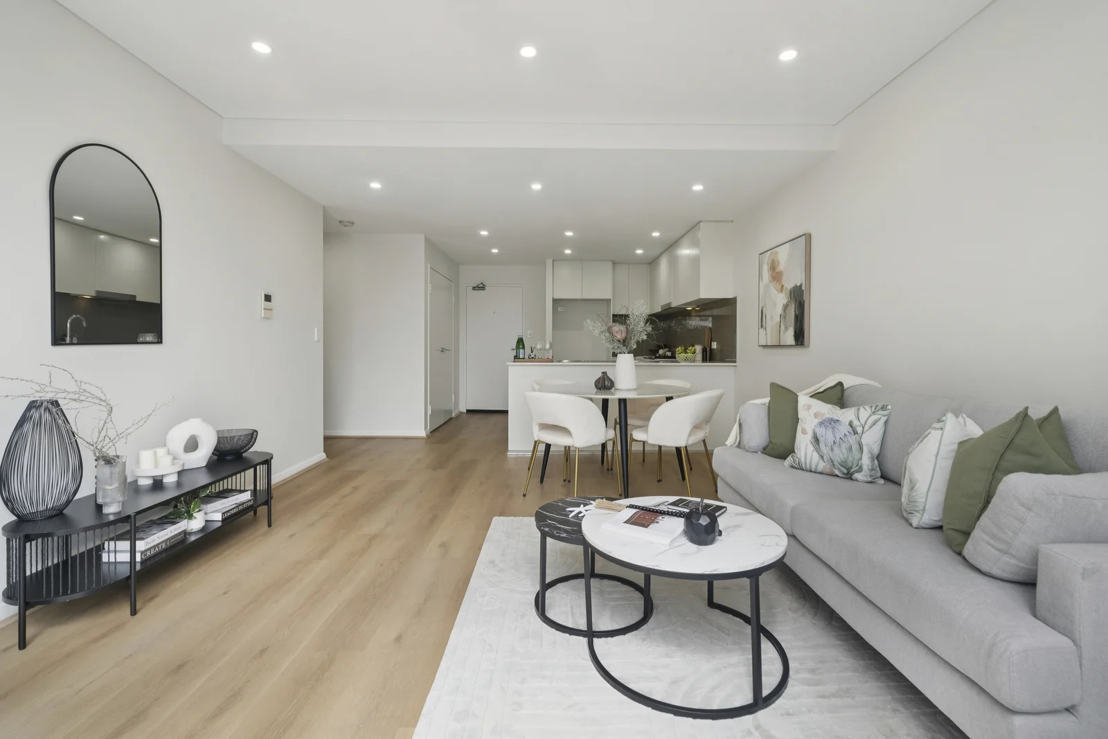 The brief arrived with a floor plan and a problem. Eighty-four square metres of internal space, two bedrooms, two bathrooms, a galley kitchen stepping down to a living zone, and a balcony facing north over the Pacific Highway. The apartment sat on the third level of a boutique block of thirty-three — modern brick and render, secure parking below, Asquith station a five-minute walk south. Good bones. Clean finishes. And completely empty.