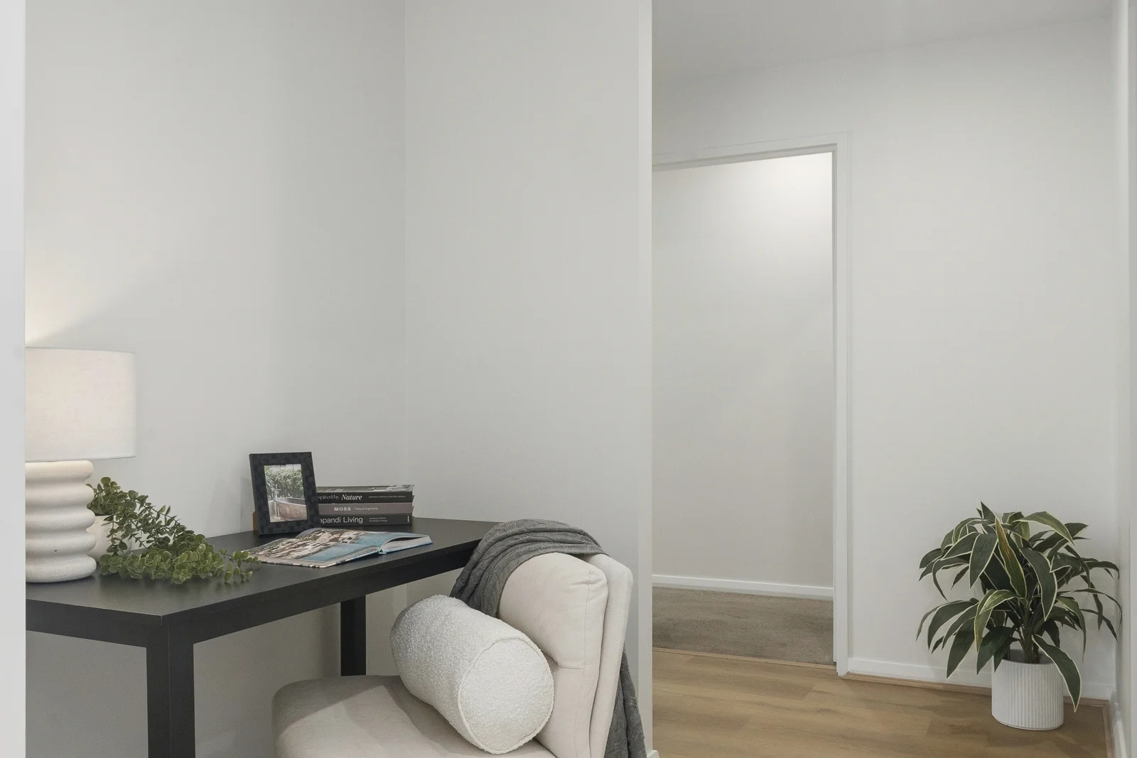 The study nook — tucked into the hallway alcove — became a reading corner. A dark desk, a white boucle armchair, a ribbed ceramic lamp, three design books fanned open. Japandi Living on the cover. A small touch, but it gave 84 square metres a third functional zone that buyers could name. Not storage. Not dead space. A study.