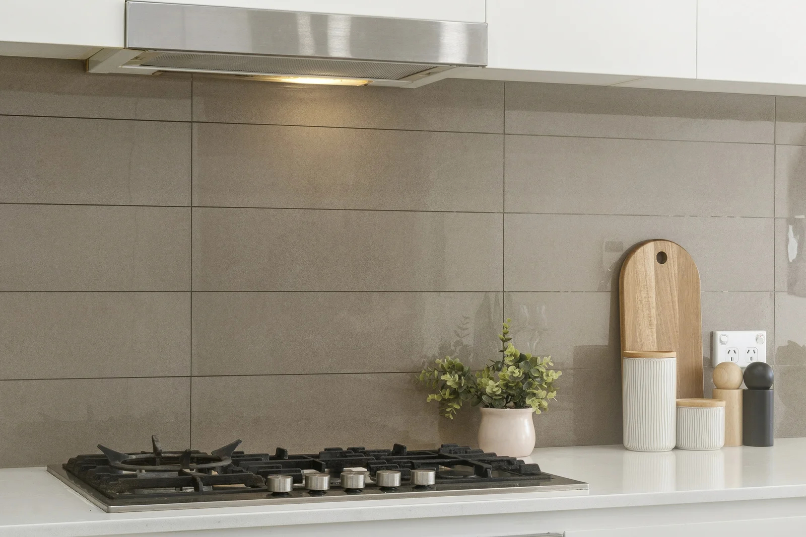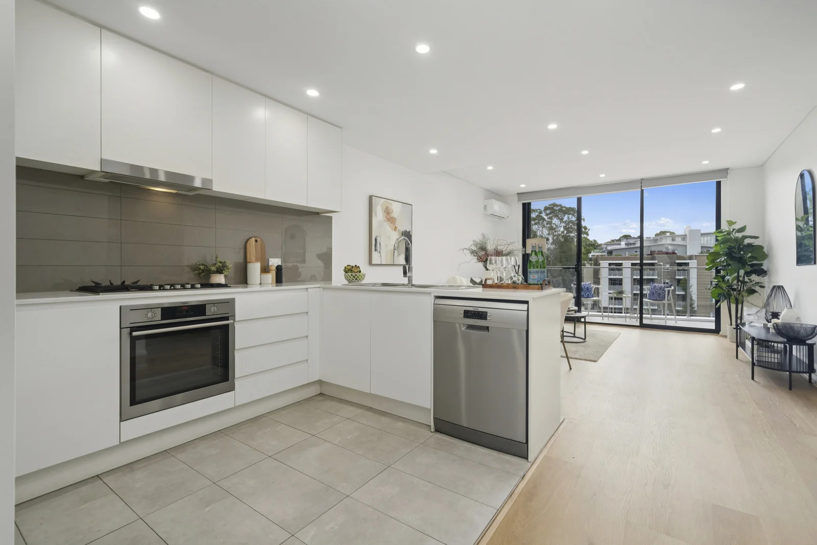 The kitchen needed minimal intervention. White cabinetry, grey tile splashback, stone benchtops — all existing finishes, all clean. A timber serving tray with green glass bottles and wine glasses on the island bench, a wooden chopping board and ceramic canisters by the cooktop. Small touches that say: someone lives here, and they cook. The connection between the kitchen and the living area — visible in the wide shot from the kitchen side — shows the full open-plan flow in one frame. That shot was planned before the first piece of furniture was placed.