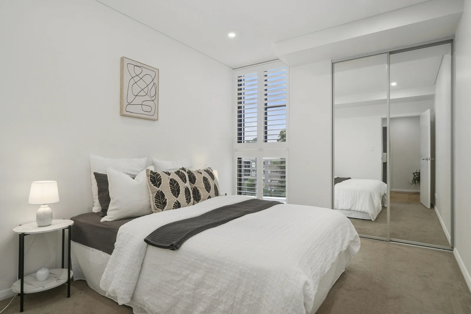 The second bedroom went quieter. White bedding, charcoal and tan leaf-patterned cushions, a dark knit throw, abstract line art in a natural frame above the bed. Mirrored sliding wardrobe doors doubled the room's visual footprint and reflected light from the louvred window. In a compact second bedroom, that mirror is not decoration. It is architecture.