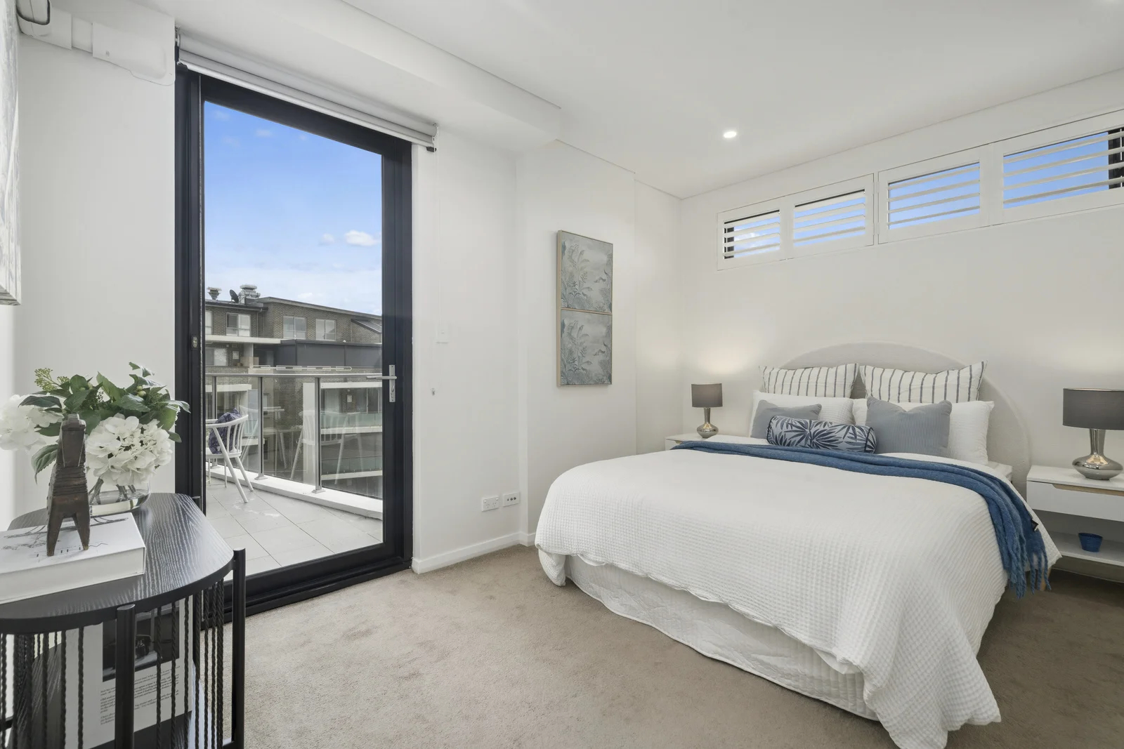 The master bedroom shifted palette entirely. White linen bedding, a navy throw draped across the foot, a striped upholstered headboard in soft grey. Coastal without being literal. Two botanical prints on the wall beside the bed caught the natural light filtering through plantation shutters and a full-height sliding door to the balcony. White hydrangeas on the side table — one detail that three out of five buyers will remember without knowing why.